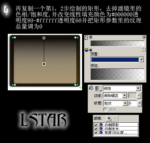 4.再復制一個第一、二步繪制的矩形,去掉濾鏡裡的色相/ 飽和度,並改變線性填充顏色為#000000 透明度80-#ffffff 透明度60,並把矩形參數裡的紋理總量調為0。