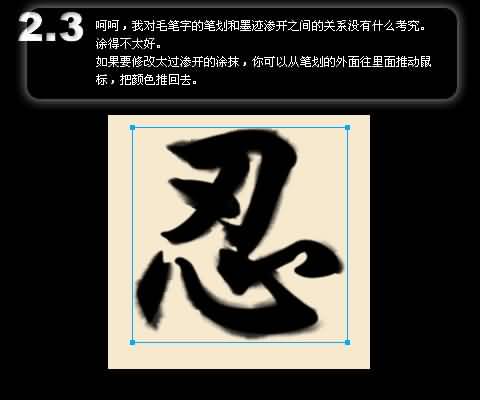 呵呵,我對毛筆字的筆劃和墨跡滲開之間的關系沒有什麼考究,塗得不太好。如果要修改太過滲開的塗抹,你可以從筆劃的外面往裡面推動鼠標,把顏色推回去。
