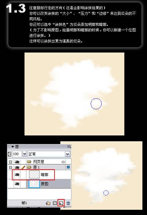 你可以改變塗抹的“大小”、“壓力”和“邊緣”來達到雲朵的不同風格。
