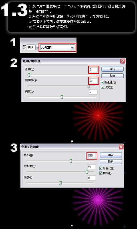 1. 從“庫”面板中把一個“star”實例拖動到畫布,混合模式使用“添加的”。