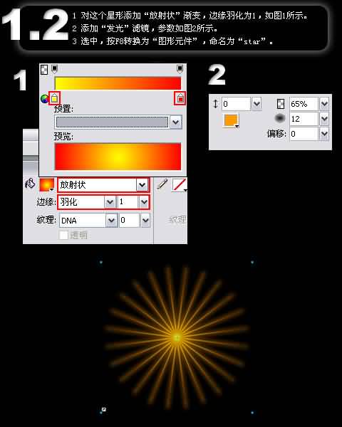1. 對這個星形添加“放射狀”漸變,邊緣羽化為1,如圖1所示。