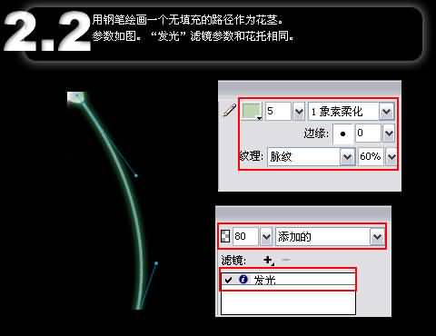 用鋼筆繪畫一個無填充的路徑作為花莖。參數如圖。“發光”濾鏡參數和花托相同。