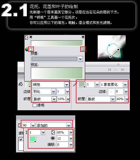 用“鋼筆”工具畫一個花托狀,你可以應用以下的填充,筆觸,混合模式和發光濾鏡。
