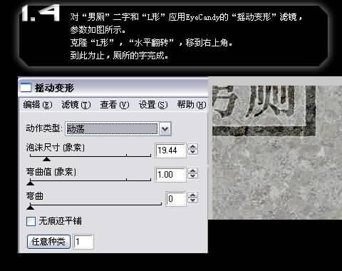 1.4 對“男廁”二字和“L形”應用EyeCandy的“搖動變形”濾鏡,參數如圖所示。