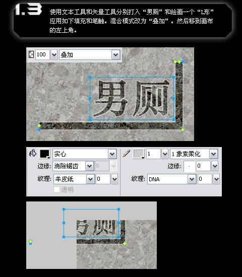 1.3 使用文本工具和矢量工具分別打入“男廁”和繪畫一個“L形”,應用如下填充和筆觸。混合模式改為“疊加”。然後移到畫布的左上角。