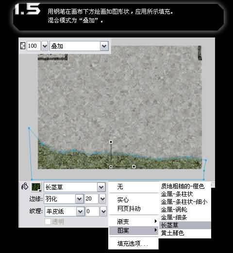 1.5 用鋼筆在畫布下方繪畫如圖形狀,應用所示填充。混合模式為“疊加”。
