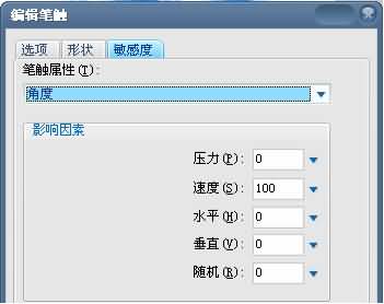 在“敏感度”卡中,在“筆觸屬性”中選擇“角度”,再在”影響因素“項目中,把 “速度”改為100。同理,再把“離散”中的“垂直“為100”,“隨機”改為7,其他都為0即可,如下兩圖: