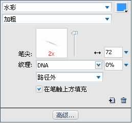 4、最關鍵的一步^o^(其實是很多步- -|||),在屬性面板中為文字添加描邊效果,顏色為#3399FF,點選“在筆角上方填充”,單擊下方的“筆觸選項…”按鈕。選擇“水彩“,”筆尖“拉到最頂端,”尖羰大小“設為72,紋理為0%,如下兩圖: