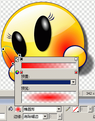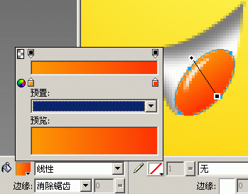 7.最後繪制漂亮MM紅紅的的小舌頭,選擇“橢圓工具”,在屬性欄中設置“填充類別”為“線性”填充,左邊顏色值為#FF9900,右邊顏色值為#FF3300,邊緣為“消除鋸齒”,方向如圖所示。還要繪制一個實心的反光喲!