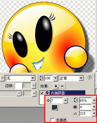 6.繪制出漂亮MM的櫻桃小嘴,填充為“實心”白色,無描邊,並填加“內側陰影”效果,距離為7,不透明度為65%,柔化為4,角度為315。