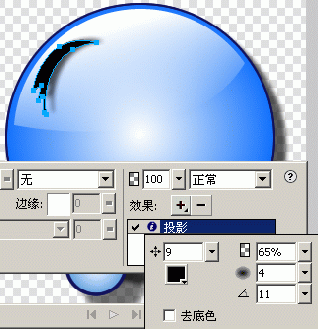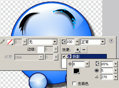 5.然後再繪制右邊的眉毛,並填加“投影”效果,設置距離為9、不透明度為65%、柔化為4、角度為11。