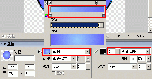 2.然後在工具欄裡選擇“橢圓選取框”工具,然後在“屬性面板”中將填充類別設置為“放射狀”,然後單擊填充顏色框,將左邊的色標顏色選擇為“#99CCFF”,右邊的色標顏色選擇為“#6666FF”,描邊顏色設置為黑色,描邊種類設置為“柔化圓形”,然後再拖動描邊大小滑桿,設置大小為6象素,按下Shift鍵,畫出一個圓形,“屬性面板”具體設置下圖所示。