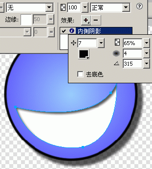 5.接下來給這個嘴巴加上“內側陰影”效果,其效果設置距離為 7 ,透明度為65%、柔化為4、角度為315,顏色為黑色,經過這樣的加工,就顯出嘴巴的效果來了。