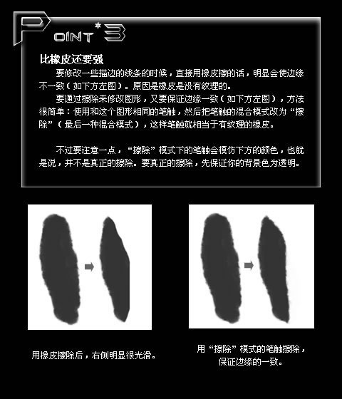 要修改一些描邊的線條的時候,直接用橡皮擦的話,明顯會使邊緣不一致(如下方左圖)。原因是橡皮是沒有紋理的。
