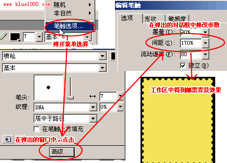 3、在畫一個矩形,大小為144*174,位置為261*143,填充顏色選擇黃色(色彩代碼:#F5E459)。邊線顏色為黑色,選擇邊線的樣式“噴槍”—>“基本”,點開“基本”菜單,選擇“筆觸選項”打開菜單,點擊“高級”按鈕,彈出“編輯筆觸”對話框,在“選項”下修改“間距”為170%,最後在工作界面我們看到郵票背景效果,如圖二。