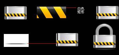 5.條紋的高光及陰影:如圖,把黑黃條紋放在鎖身的合適位置上,在黑黃條紋上畫一等寬高度為2的矩形,不透明為23.再畫一高度為2的矩形,羽化,線性漸變是兩邊的不透明度降低,方在黑黃條紋層下面。
