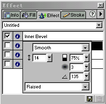第六步、 選中文字對象,打開Effect(效果)面板,執行其中的Bevel and Emboss--Inner Bevel(斜角和浮雕--內斜角)效果命令,在隨後彈出的設定框內進行相應設定如下:斜角方式采用Smooth(平滑);斜角寬度大小為14像素,其余各項保持默認值不變。具體設定方式請參考圖05: