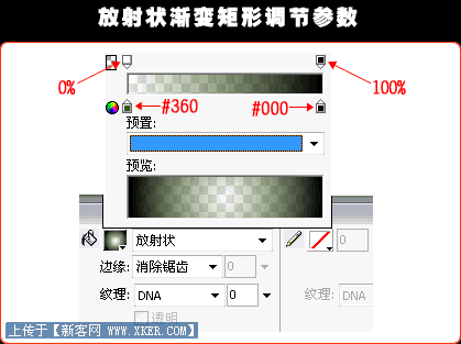 3、拉一個大小為500*350的放射狀漸變的矩形。參數設置如下。