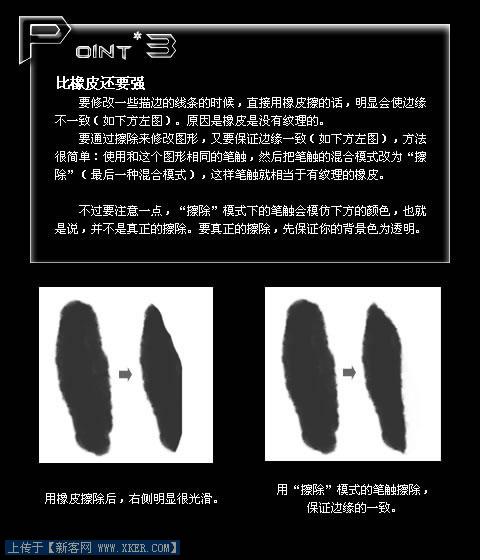 要修改一些描邊的線條的時候,直接用橡皮擦的話,明顯會使邊緣不一致(如下方左圖)。原因是橡皮是沒有紋理的。