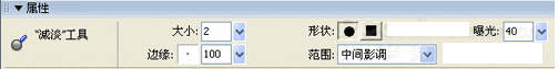 6、選取“圖像編輯”面板上的“減淡”工具,同時在屬性檢查器上作如下圖所示的設置,注意“范圍”選擇“中間影調”,“大小”不要太大,“曝光”數也不要太大,具體設置見下圖:
