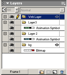 5.好了,前期工作基本就緒,開始真正的動畫了,現在看看你的幾個主要面板都打開了嗎?庫面板 (Window->Library F11)、幀面板(Window->frames Shift+F2)、層面板(Window->layers F2)。如果沒有打開,按括號中的打開吧。首先點擊層面板,雙擊我們的背景所在層,在彈出的小窗口裡的方框裡打上勾,(在輸入欄裡可以給圖層起個好記的名字,看你的愛好了~!),即共享這個圖層,也就是說,在以後的動畫中,這一層是始終不變的。完成後圖層右面出現個膠片的圖標,對,就是那個小梯子,呵呵,如圖