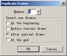 如果步驟沒有錯誤的話,畫布中的人物應該成了綠色了。單擊幀面板右上角的小箭頭,選擇填加幀Duplicate frame...,在彈出的對話框內選擇填加一幀,在原來幀後面,如圖(一般默認,直接點確定就可以)。