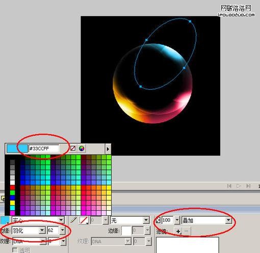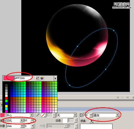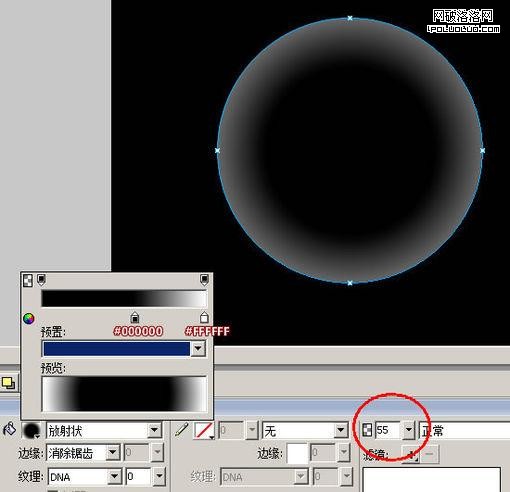 啟動Fireworks -> 將背景調成“黑色”,在畫布中畫一個圓。