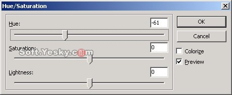 (3)選中該幅圖像按Ctrl+Shift+D兩次,克隆圖像兩次。然後選中其中的一幅圖像,點擊“Filters”,選擇“Adjust Color”>>“Hue/Saturation”,這時在彈出對話框中調整色調的值,如圖3所示。同樣方式調整另外一幅圖像的顏色,最終得到圖4所示的圖像效果。