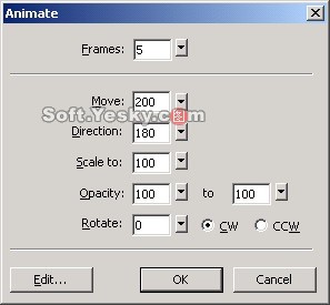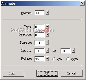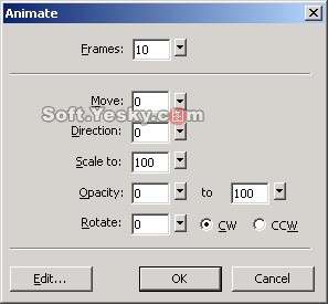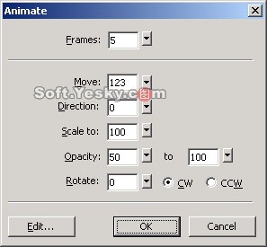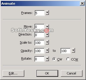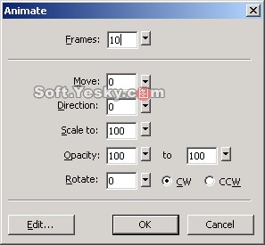 我們通過對不同符號對象的不同設置實現了不同的動畫效果,這裡讀者可以在即嘗試著設置動畫屬性對話框中的不同參數來設置動畫圖像的效果,包括 Frame(幀數)、Move(運動的距離)、Direction(方向)、Scale to(尺寸大小)、Opacity(不透明度)、Rotate(旋轉)等值,從而產生不同的效果。