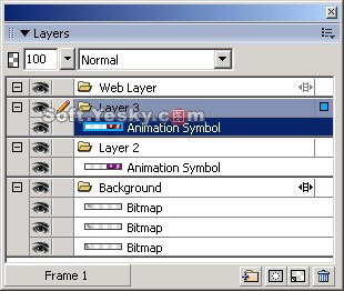 (8)接著我們點擊“Window”菜單,分別把“Layers”、“Frames”和“Library”三個面板打開,為了我們將來創建動畫服務。在 Layers(層)面板中選中Layer 1圖層雙擊鼠標給圖層命名為Background,並選中“Share across frames”復選框即共享這個圖層,如圖9所示。