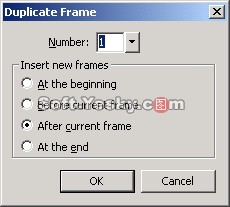 (16)單擊幀面板右上角的按鈕,在彈出菜單中選擇“Duplicate Frame”,這時彈出了復制幀對話框,我們在其中選擇After current frame單選框將復制的幀放置到當前幀之後,如圖19所示。