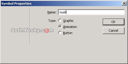 (4)選中其中的一個圖片如左邊的紫色圖片,按快捷鍵F8或者右鍵在彈出菜單中選擇Convert to Symbol准備將圖像轉換為符號。在彈出的對話框內為符號命名並選擇動畫符號(Animation),如圖5所示。