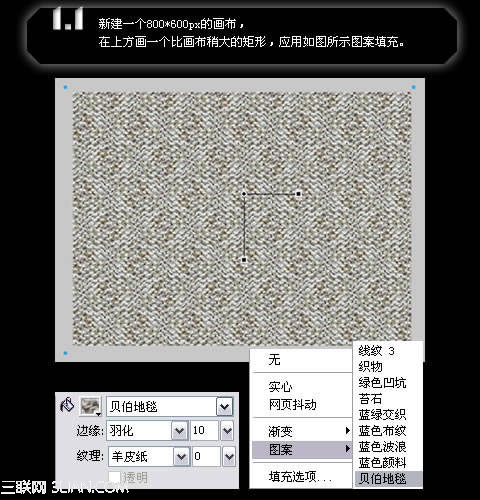 新建一個800*600px的畫布,在上方畫一個比畫布稍大的矩形,應用如圖所示圖案填充。