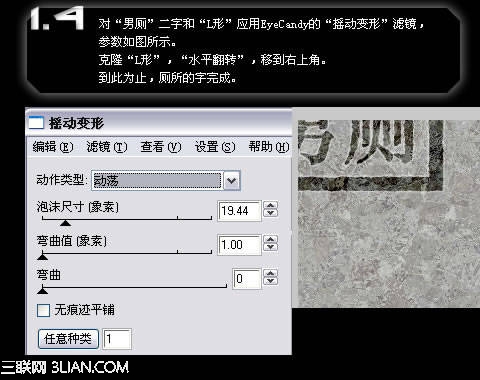 對“男廁”二字和“L形”應用EyeCandy的“搖動變形”濾鏡,參數如圖所示。