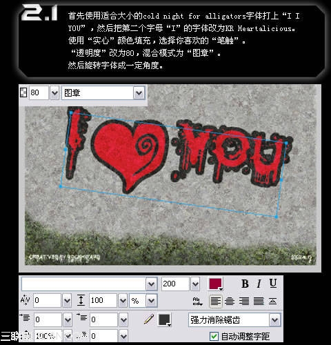 首先使用適合大小的cold night for alligators字體打上“I I YOU”,然後把第二個字母“I”的字體改為KR Heartalicious。