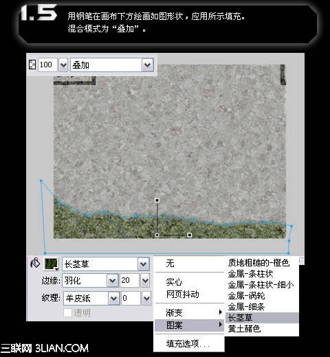 用鋼筆在畫布下方繪畫如圖形狀,應用所示填充。混合模式為“疊加”。