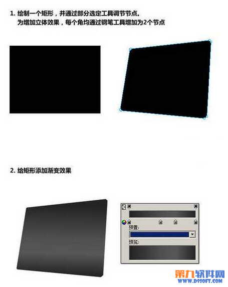 效果圖: 路徑制作這麼一個圖形,然後拉漸變 復制一個在上面,稍微偏移些,如圖拉漸變 加濾鏡 加高光:也是復制一份,用‘刀’