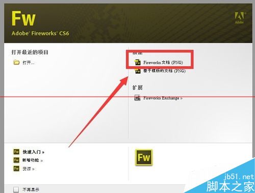 1、打開你的Firework軟件,沒有就百度一下,打開之後,選擇Firework文檔,第二行的基於模板創建,是指默認的一些畫布尺寸,如果你經常使用Firework,就很有必要自己創建一些默認的模板。