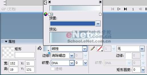 3. 利用矩形工具繪制一個寬 152,高 19 的矩形,在屬性檢查器中設置描邊為無,填充類別改為線性, 修改線性填充的顏色樣本,第一個顏色樣本的顏色為#E6FFFF,然後單擊漸變色階下面的區域,新增 一個新的顏色樣本,顏色為 #A4BECF,最後一個顏色樣本為 #FFFFFF,具體設置如圖所示: