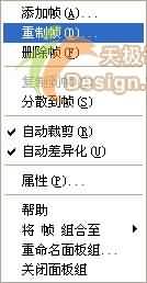 10、單擊【幀】面板右上角處的小黑三角,出現彈出菜單,選擇【重置幀】這個選項,如圖10所示。
