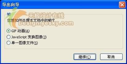 16、點擊畫面下邊狀態欄中的播放按鈕,就可以對動畫效果進行預覽,滿意以後就可以將圖片導出了,由於文件中包含動畫,我們不能簡單的保存,單擊文件,選擇導出向導,會出現關於處理幀的對話框,在這裡我們選擇GIF動畫,如圖16所示。