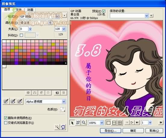 小結:本例中我們用Fireworks設計了一幅以三八婦女節為主題的女性宣傳畫,並適當增加了一些簡單的動畫效果,相信大家一定會對這個美麗溫柔的女性留下深刻的印象的。在繪制過程中,主要用到了直線和橢圓工具,並對這些工具所繪制的路徑進行了各種自由變形,從而得到較好的視覺效果。