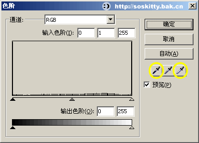 4、再次調節色階,這次需要利用“選擇陰影顏色”和“選擇高亮顏色”兩個小吸管調整黑白場,左面的吸管吸取的顏色為”黑場“(既:用它選中點的顏色以及比他更深的顏色都變為最深色(黑色)),同理,右面的吸管用來設置”白場“: