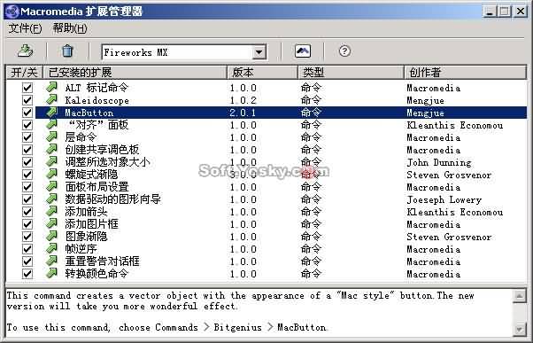 2) 在第一步的擴展管理器中有使用這個擴展的英文說明,最後一段話是“To use this command, choose Commands > Bitgenius > MacButton.”,意思就是說如果要使用這個擴展時,只需要選擇“命令”菜單下的“Bitgenius| MacButton”即可。