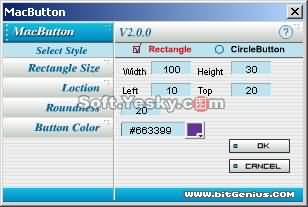 首先,新建一個200×100的文件。選擇“命令”下拉菜單中的“Bitgenius| MacButton”,這樣會跳出創建透明按鈕對話框,如圖6所示。