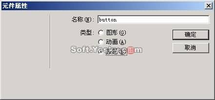 下一步就需要將這個組合轉換為按鈕了。選擇這個組合,選擇“修改”菜單下的“元件”|“轉換為元件…”,得到圖9所示的元件屬性彈出窗口,命名為 “button”,選擇“按鈕”。單擊“確定”,這是組合已經被轉換為按鈕了,其左下腳出現了一個小箭頭並且為其添加了一個切片,如圖10所示。