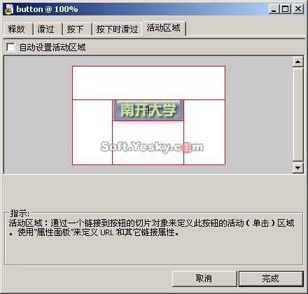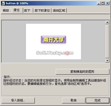 6) 這樣釋放狀態的編輯已經結束,現在開始編輯滑過狀態。點擊按鈕編輯器頂端的“滑過”選項欄,選擇“復制彈起時的圖形”。選中透明按鈕的組合,通過屬性面板將其透明度稍微調低一些。然後選擇文本,修改其填充顏色為#FFFF66,得到如圖14所示的滑動狀態。
