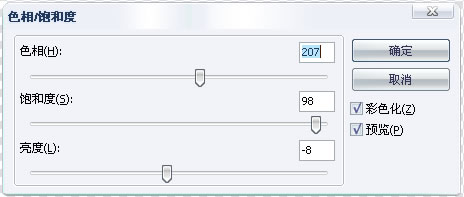 到這裡就要給圓形上色了,繼續點選濾鏡--->調整顏色--->色相/飽和度,屬性如下圖: