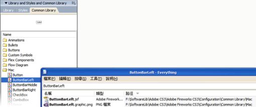 4.作為參考,我們打開Fireworks內置動態元件的JSF腳本文件,打開公用庫面板中的Mac目錄,隨便找一個名字獨特一點的按鈕(本例選擇“ButtonBarLeft”),把它的名字記下來,然後搜索這個名字就可以獲得這個路徑: