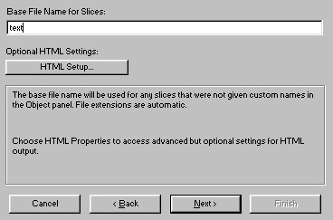 3)單擊"next",在隨後的窗口中鍵入切片的基礎文件名,這個名字會應用到圖片每個切片中,另外你可以單擊"html setup"按鈕進行更高級的設置.如圖